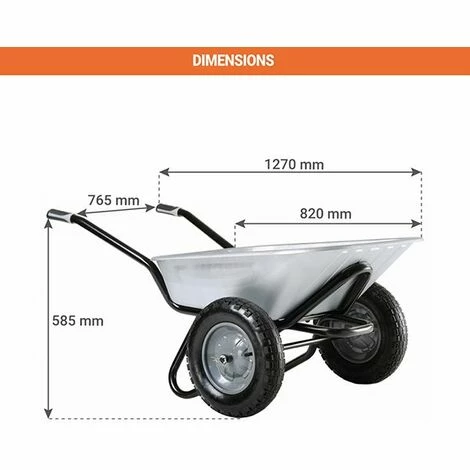 – Dimensions de la brouette : 1270 x 765 x 585 mm.