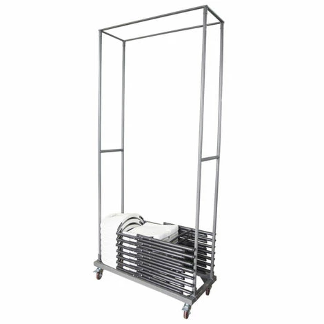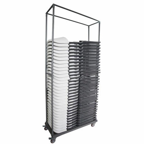 Chariot de transport/stockage de chaises de réception pliantes parfait pour vos prestations événementielles en salle ou en plein air de type mariage, anniversaire, baptême, incentive, rassemblement, concert, séminaire, banquet. L’assemblage du chariot est très facile, il se fait par clips et ne nécessite aucun outil.