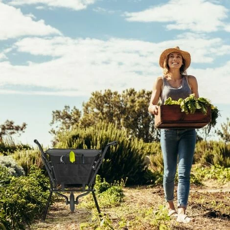 Facilement pliable_x000D_Pour les travaux du jardin_x000D_Se range de manière peu encombrante_x000D_Avec roue en caoutchouc sans air_x000D_Poignées en plastique