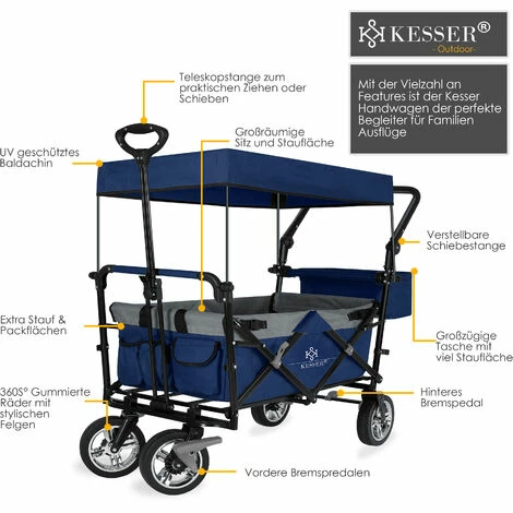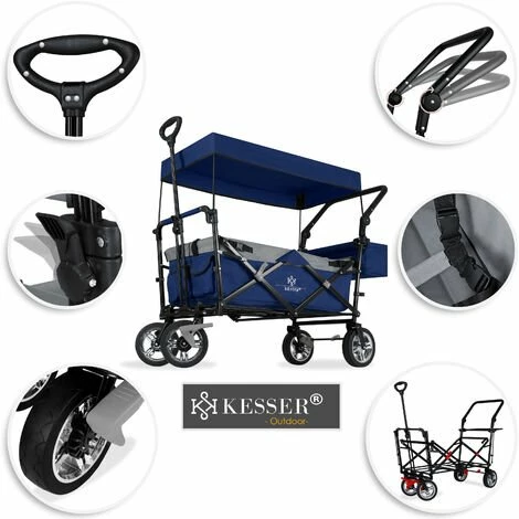 Son espace de chargement, son sac XXL supplémentaire à l’arrière ainsi que ses divers supports offrent un espace suffisant pour partir avec vos enfants faire des excursions, des festivals ou d’autres activités de loisirs. Il peut également se plier de manière compacte si besoin. Le toit amovible offre par ailleurs une protection efficace contre le soleil et les averses. Ici, la fonctionnalité rencontre un design bien pensé. En plus du sac XXL intégré à l’arrière et de diverses poches de rangement, le chariot pliable GT-9000 est équipé de deux poignées pour le tirer ou le pousser, de roues pivotantes à 360° ainsi que de freins avant et arrière. Ce chariot de transport GT-9000 de haute qualité se monte et se plie rapidement en un tour de main pour se ranger dans le sac de transport (fourni). Il est idéal pour faire du camping, des barbecues, du shopping au centre commercial, des randonnées dans un parc ou d’autres activités de plein air. Pour protéger au mieux vos enfants et vos affaires du soleil, son toit solaire amovible est protégé contre les UV. Fabriqué en nylon Oxford 600D d’excellente qualité résistant à l’usure, il protège également de la pluie. Ce chariot de transport est équipé d’une poignée centrale réglable avec fonction de basculement et d’une roue avant pivotant à 360°. Le matériau résistant et la structure stable du châssis offrent une capacité de charge maximale de 80 kg.