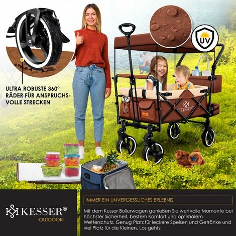 KESSER GTS-9100 – chariot de transport pliable avec toit amovible pour une utilisation polyvalente, roues à suspension et entièrement caoutchoutées, pack de freinage universel et harnais de sécurité pour une grande sécurité Le chariot de transport pliable a des talents véritablement multiples par rapport aux autres chariots de transport