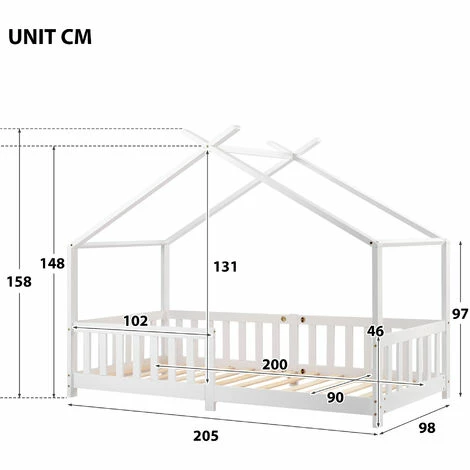 1. Un cadeau adorable. La forme enfantine et la couleur blanc pur sont un excellent cadeau pour les enfants. Ce beau lit donne à la nuit des enfants une couleur de rêve.2. Grand espace de stockage. La hauteur de la planche de lit depuis le sol est suffisamment élevée pour ranger des objets. Les matelas et les petites pièces peuvent être rangés plus facilement. Le dessus est plus spacieux et ouvert pour que l’enfant ne touche pas le front lors de l’entrée et de la sortie.3. Mesures de sécurité. Plusieurs garde-corps assurent la sécurité des enfants et offrent une protection supplémentaire lorsqu’ils jouent ou se retournent.4. Respectueux de l’environnement. Le pin certifié FSC est solide et sûr, sans danger pour les enfants et favorise le développement durable.5. Assemblage facile. Des instructions détaillées et les outils d’assemblage associés peuvent vous aider à terminer l’assemblage facilement. S’il vous plaît profiter du plaisir de construire une maison!