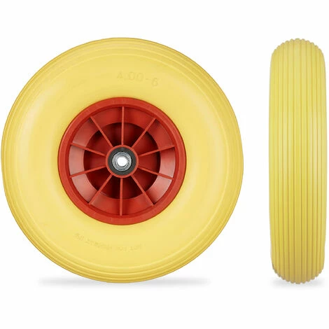 Si vous avez besoin d’une roue pour votre brouette de jardin, optez pour cette roue en caoutchouc increvable. La roue est résistante aux épines, clous et autres objets tranchants. Le roulement à aiguilles et la surface profilée offrent un transport confortable de votre brouette ou chariot. Cette roue convient pour les brouettes, chariots ou autres du commerce. La jante est faite en plastique robuste. Celle-ci est livrée avec 3 adapteurs pour 4 tailles différentes d’axes.