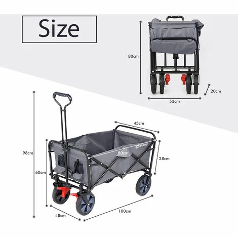 - Brouette robuste a une grande capacité: Le chariot est équipé d’un cadre en acier robuste et d’un tissu résistant, le wagon peut charger jusqu’à 80 kg. Dimension de dimension extérieure ouverte 98 * 50 * 76 à 101cm, dimension de chargement intérieur mesure 80 * 45 * 28cm pour offrir la grande zone de stockage, la dimension s’est effondrée est 76 x 50 x 20cm, poids net environ est 10.5KG.