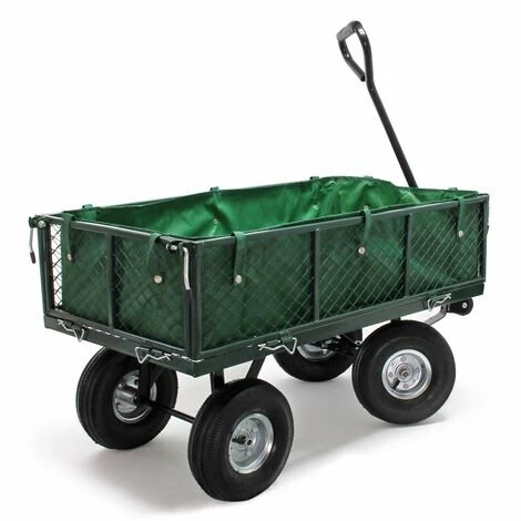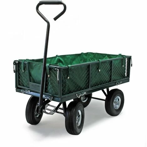 Grâce aux pneumatiques et son long timon à main avec poignet on peut transporter un charge jusqu´à 300 kg. En outre, ce chariot est équipé d´une bâche détachable.